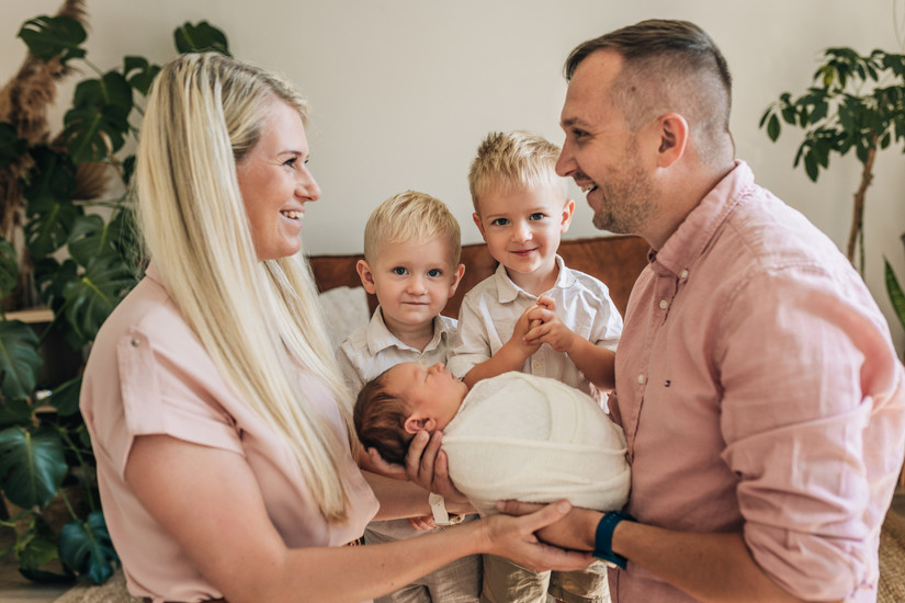 Jdete na focení i se starším sourozencem? Zvažte, zda je pro něj čekání v ateliéru vhodné. Můžeme se domluvit tak, že přijdete na etapy, maminka s miminkem jako první a tatínek se sourozencem si zajedou třeba na nákup, v případě, že jste přesvědčení o tom, že je dítko schopné čekání vydržet, tak mu vezměte s sebou něco na zabavení, pokud uplácíte, dostatek úplatků, jestli mu dáte mobil, je mi to jedno, soudit vás nebudu. Důležité je ho (ji) udržet v klidu, než nafotíme miminko. Pokud přejdeme ke společnému focení, řekněte mi, zda je starší sourozenec zvyklý miminko chovat, nebo to v jeho možnostech není. Když budeme sourozence fotit spolu, neříkejte mi nervózně teď to foť, nefotím na váš povel, fotím, když vidím, že ta fotka k něčemu je. Pokud staršího sourozence začnete vychovávat, když bude mít nějaký momentální zásek, tak se zasekne ještě víc, musíme improvizovat a vymyslet, jak to udělat s ním, aby spolupracoval. Řvaní a pleskání po zadku v tomto případě není nic platné. Další možnost je, že přejdeme k focení jen rodičů a nejmenšího aktéra a sourozenec se přidá sám, když bude chtít. Většinou to tak je a funguje to nejlépe.